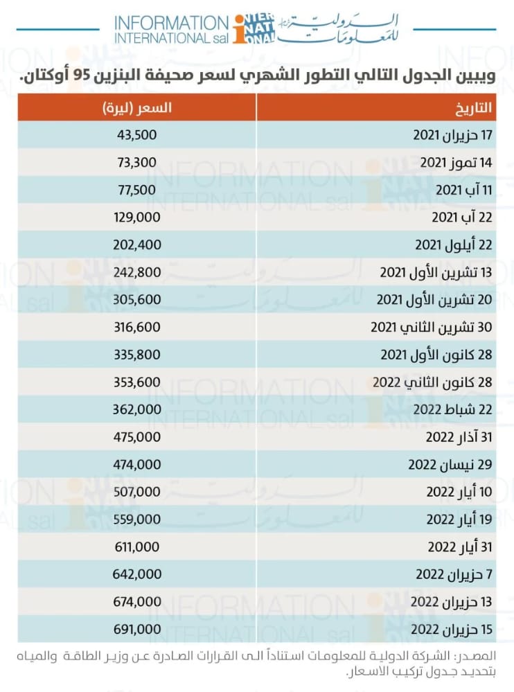 نشرت "الدولية لمعلومات" في تقريرها الجديد أنّ "سعر صفيحة البنزين عيار 95 أوكتان وصل يوم الأربعاء في 15 حزيران 2022 إلى 691 ألف ليرة بينما كان السعر قبل سنة في 17 حزيران 2021، 43500 ليرة، أيّ بارتفاع خلال سنة مقداره 647500 ليرة ونسبة 1,488 في المئة أيّ 16 ضعفاً".
