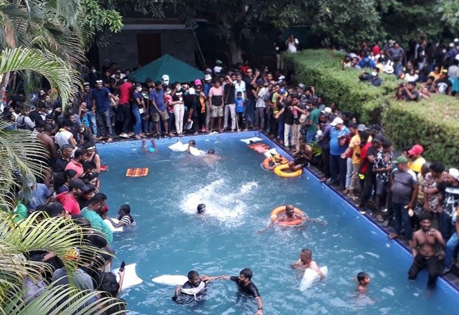 كان المحتجون الذين لف كثيرون منهم نفسه بعلم سريلانكا قد تدفقوا إلى مقر إقامة الرئيس، الذي يعود إلى الحقبة الاستعمارية، يوم أمس السبت، وقفزوا إلى حمام السباحة.