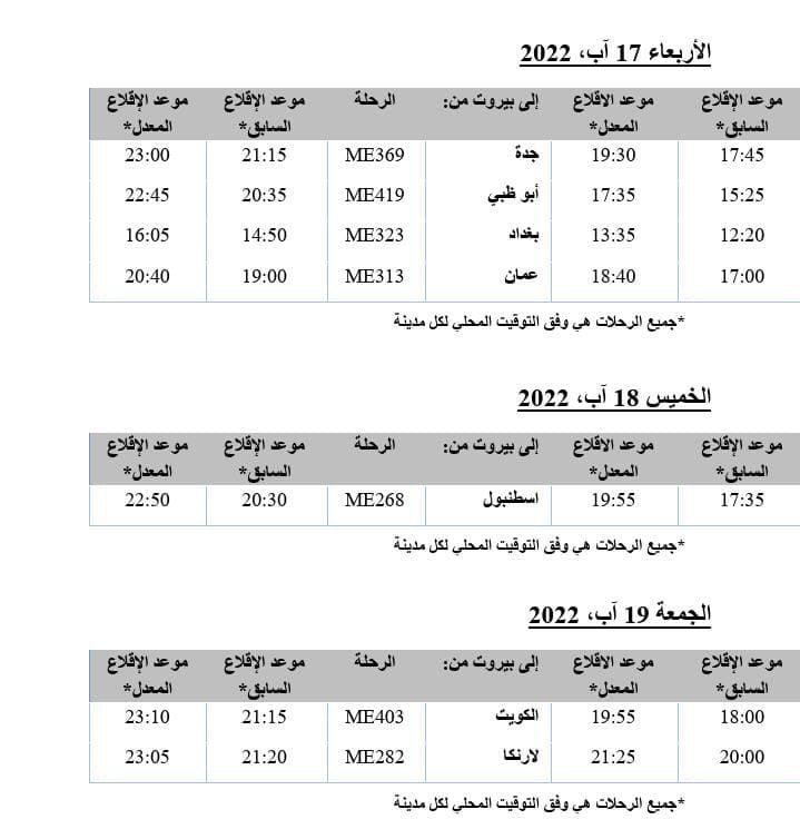 تعلن شركة طيران الشرق الاوسط – الخطوط الجوية اللبنانية عن تعديل جزء من جدول رحلاتها من 17 الى 21 آب 2022 وذلك لأسباب تشغيلية خارجة عن إرادتها.