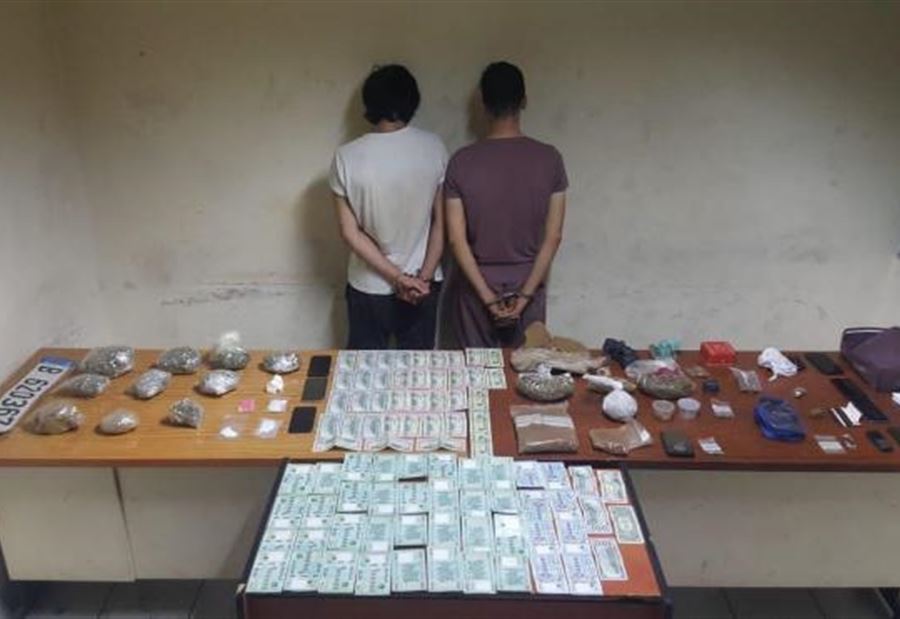 وتابع, "بتفتيشهما، ضبط بحوزة الموزّع ما يلي: /500/ غ من مادة الماريجوانا، و/630/ غ من مادة حشيشة الكيف، و/75/ غ من مادة السالفيا، و/6/ مظاريف من مادة الكوكايين زنتها حوالي /320/ غ، و/3/ مظاريف من مادة الباز زنتها حوالي /32/ غ، ومظروف بداخله حبوب كبتاغون زنتها حوالي /11/ غ، ومسدس أميري، ومبلغ /50/ دولار أميركي مزيّف، و /3/ هواتف خلويّة، ومبلغ مالي، كما ضبط بحوزة الثاني هاتفين خلويين".