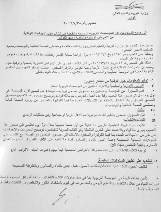 صدر عن وزارة التربية تعميم إلى جميع المسؤولين عن المؤسسات التربوية الرسمية والخاصة في لبنان حول الإجراءات الوقائية من الأمراض الوبائية والمعدية ومنها الكوليرا.