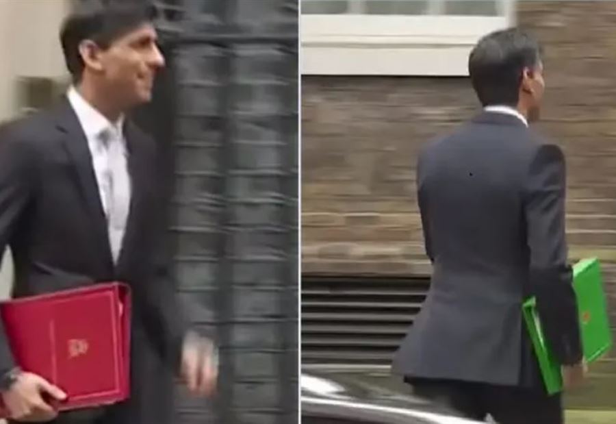 ونرى سوناك في الفيديو الذي انتشر سريعا بمواقع التواصل، وهو يخرج من مقر الحكومة في "10 داونينغ ستريت" بلندن، ثم يمشي على الرصيف حاملا الملف بيمناه، ويمر بجانب سيارات متوقفة، ثم تحجب إحداها الملف لفترة وجيزة عن الأنظار، وعندما خرج من مجال الحجب، بدا أن لون الملف تغير إلى الأخضر، في لحظة مربكة حيّرت المشاهدين.
