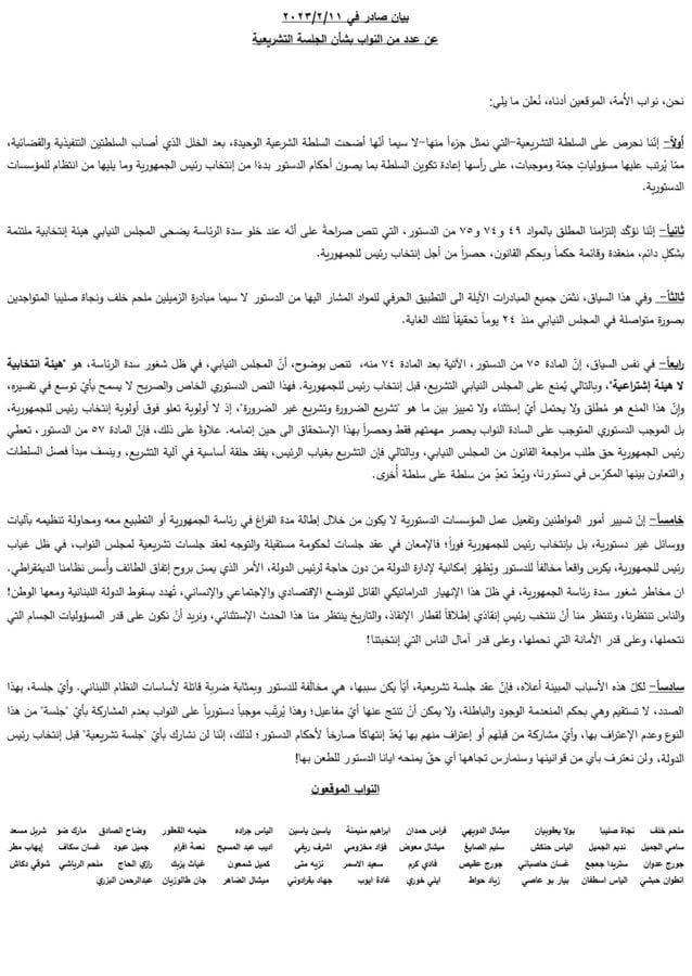 صدر عن عدد من النواب بيانا، أكدوا فيه عدم مشاركتهم في أي جلسة تشريعية قبل انتخاب رئيس الجمهورية، مؤكدين أنهم لن يعترفوا بأي من قوانينها، وسيمارسون تجاهها أي حقّ يمنحهم إياه الدستور للطعن بها.