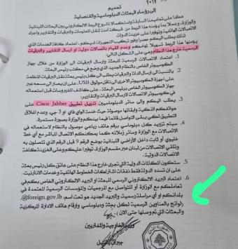 عطفاً على التعميم الصادر في 2021/09/15، صدر آخر بالرقم 16/أ.ع في 2023/01/27 ليحصر إرسال البرقيات بعنوانين شخصيين: الأول، يعود إلى الوزير عبدالله بو حبيب (arbouhabib@gmail.com)، والثاني للأمين العام للوزارة، السفير هاني شميطلي (hanich@hotmail.com). أما البرقيات السياسية الأخرى ذات الطابع العادي، فتُرسَل إلى الوزارة عبر الرموز، أسوة بتلك العائدة لسائر المواضيع المتنوعة الأخرى. تعميم أقلّ ما يقال فيه، برأي مصادر مطّلعة، إنه «كتلة مغالطات». فماذا وراءه؟