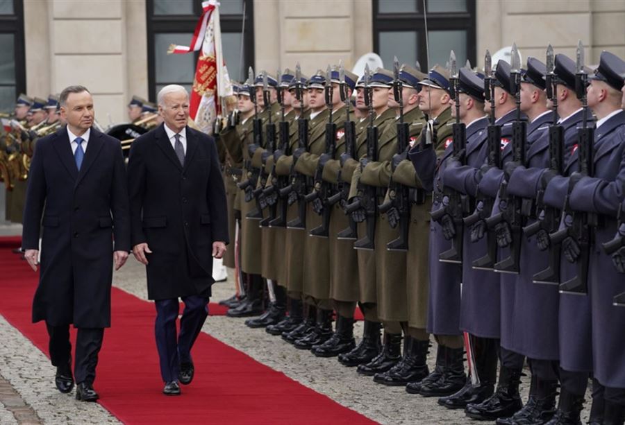 واستقبل دودا بايدن أمام القصر الرئاسي، الثلاثاء، قبل أن يعقدا اجتماعا ثنائيا حضره كبار المسؤولين. وفي المساء، من المقرر أن يلقي بايدن خطابا حول حشد واشنطن العالم لدعم أوكرانيا مع دخول الحرب عامها الثاني.