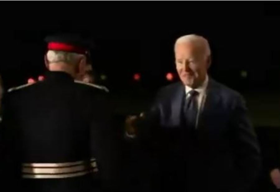 خلال نزول بايدن من طائرته الرئاسية "أير فورس وان"، توجه نحو سوناك الذي كان بانتظاره على مدرج الطيران، وعوضا عن السلام عليه بحرارة، صافحه بايدن بسرعة، ثم قام بدفعه قليلا، وتوجّه لتحية ممثل الملك، وهو ملازم كبير في السن.