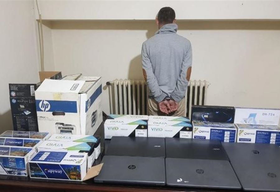 وأضاف البيان، "على أثر ذلك باشرت القطعات المختصة في شعبة المعلومات في قوى الأمن الداخلي إجراءاتها الميدانية والاستعلامية لتحديد هوية الفاعل وتوقيفه. وبنتيجة الاستقصاءات والتحريات المكثّفة، تمكّنت الشعبة من تحديد هوية السارق وهو يعمل في مجال صيانة الكاميرات داخل المدرسة المذكورة ويدعى: م. ح. (من مواليد عام 1995، لبناني)وبتاريخ 19-04-2023 وبعد عملية رصد ومراقبة دقيقة، نفّذت إحدى دوريات الشعبة عملية مداهمة لمنزل الأخير في محلة المنارة وأوقفته داخله. وبتفتيش المنزل، تم ضبط /6/ حواسيب، آلتَيْ طباعة و /13/ محبرة عائدة لها، و/3/ مراوح تبريد وحماية لأجهزة الحواسيب".