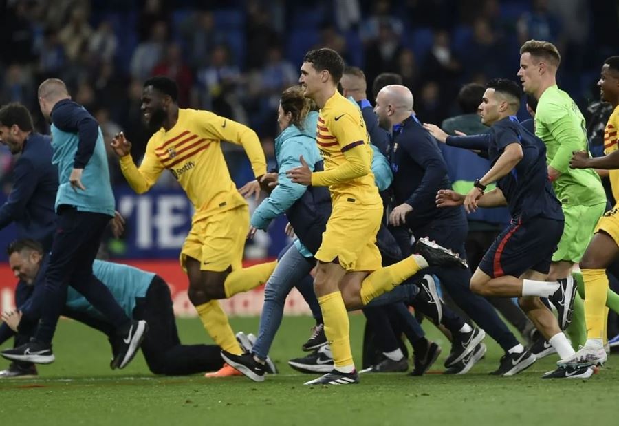 وخلال احتفال نجوم برشلونة على أرضية ملعب إسبانيول، بالرقص على شكل دائرة، اقتحم عدد من مشجعي إسبانيول الملعب.