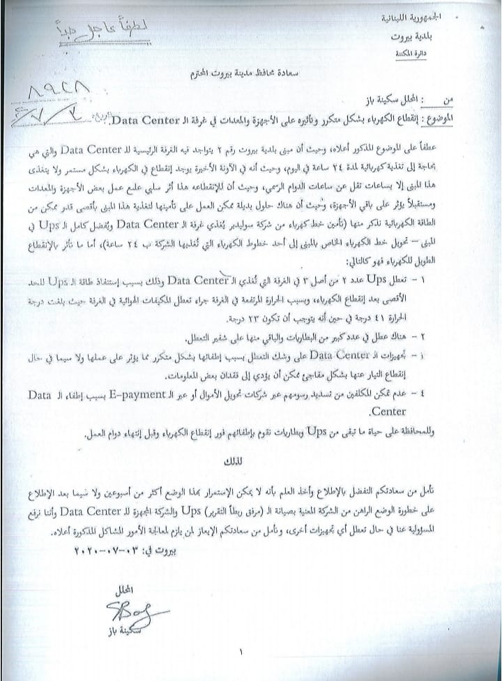 في عودة سريعة إلى الوراء، وتحديداً إلى تاريخ 03/07/2020، توجّهت المحلّلة سكينة باز - المسؤولة في حينه عن دائرة المكننة - بكتاب عاجل جداً إلى محافظ بلدية بيروت، القاضي مروان عبود، تشير فيه إلى عدم إمكانية الاستمرار بالعمل في ظل الانقطاع المتكرّر للتيار الكهربائي لما لذلك من تأثير على أجهزة الـUPS والـData Center. وممّا جاء في الكتاب: «إننا نرفع المسؤولية عنا في حال تعطّل أي تجهيزات أخرى، ونأمل من سعادتكم الإيعاز لِمَن يلزم لمعالجة المشاكل المذكورة». باز شرحت في كتابها أن الغرفة الرئيسية للـData Center، والموجودة في مبنى البلدية رقم 2، تتأثر بشكل مباشر بالانقطاع المتواصل للتيار الكهربائي محذّرة من الأضرار التي يمكن أن تلحق بكافة الأجهزة مستقبلاً في حال لم تتم معالجة الموضوع جدّياً.