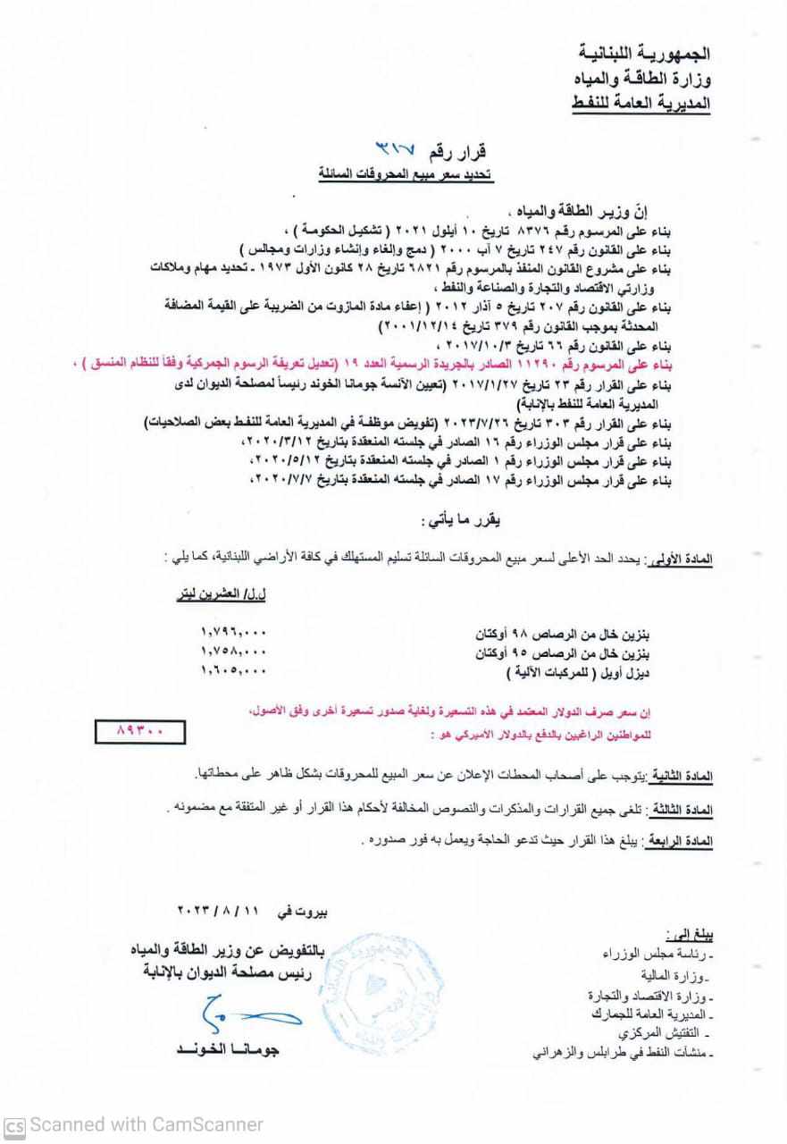- بنزين 98 أوكتان: 1.796.000 ليرة