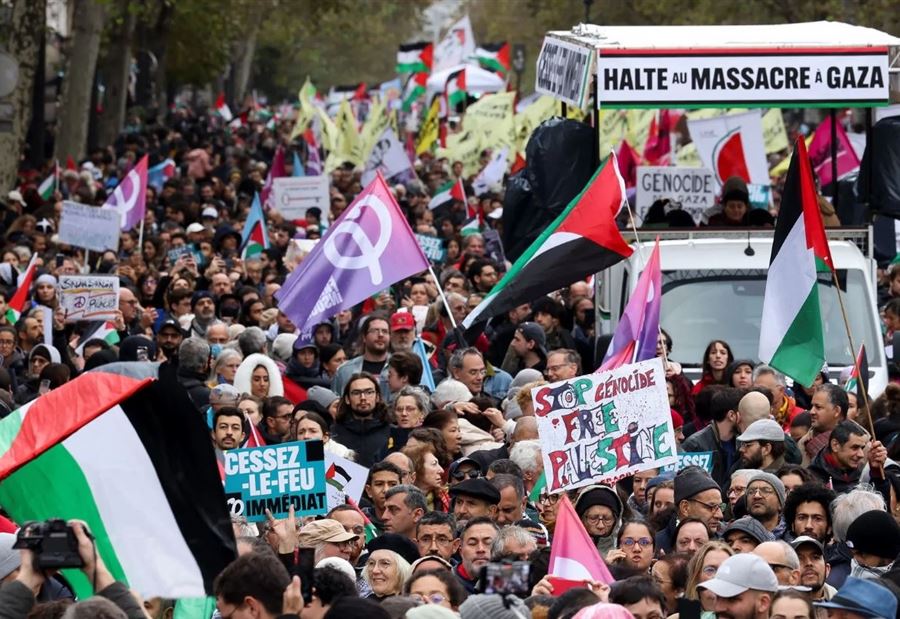 شهدت باريس تظاهرات حاشدة، حيث سار آلاف المحتجين في وسط العاصمة للمطالبة بوقف إطلاق النار رافعين لافتات كتب عليها "أوقفوا دائرة العنف" و"عدم فعل شيء، وعدم قول شيء، يعني التواطؤ".