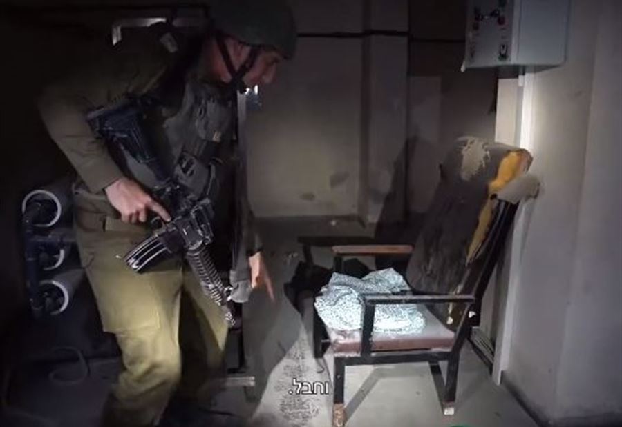 وقال هاغاري في المقطع الذي صوّره من عين المكان: "الجيش الإسرائيلي وجد في أسفل زجاجة لرضاعة طفل وقطعة حبل موصولة بكرسي، ما يدل على وجود رهائن في المكان".