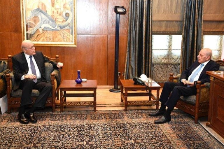 استقبل رئيس مجلس النواب نبيه بري، اليوم الثلاثاء، في عين التينة، رئيس حكومة تصريف الأعمال نحيب ميقاتي، الذي وضع رئيس المجلس بنتائج إتصالاته ولقاءاته في الخارج حول لبنان وما يجري في المنطقة.
