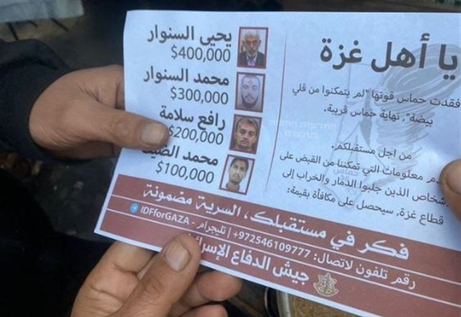 ألقى الجيش الاسرائيلي، الخميس 14 كانون الأول 2023، منشور على سكان قطاع غزة تضمن مكافآت مالية، مقابل الإدلاء بمعلومات عن أماكن وجود عدد من قادة حماس؛ وذلك بعد فشله في الوصول إليهم على مدار 69 يوماً من حربه على القطاع، ما أثار تفاعلاً على منصات التواصل الاجتماعي.