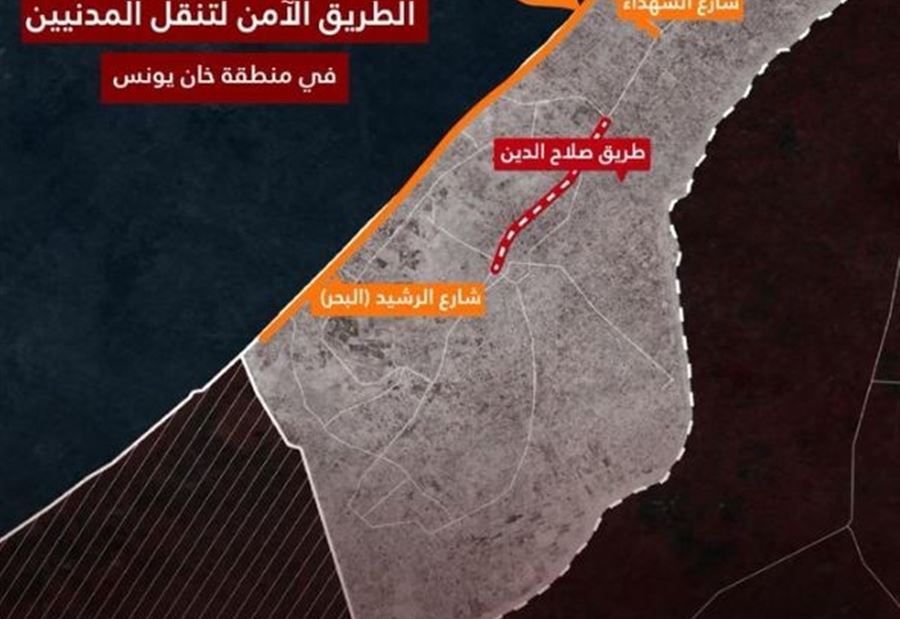 - القتال والتقدم العسكري لجيش الدفاع في منطقة خان يونس لا يسمحان بتنقل المدنيين عبر محور صلاح الدين في المقاطع الواقعة شمالي وشرقي مدينة خان يونس. يشكل محور صلاح الدين في هذه المقاطع ساحة قتال فمن الخطورة الوصول إليه!؛
