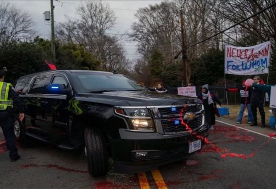استهدف متظاهرون مؤيدون لفلسطين، مساء أمس الخميس، موكب وزير الخارجية الأميركي أنتوني بلينكن بالطلاء الأحمر أثناء مروره بعد عودته من رحلته إلى الشرق الأوسط.