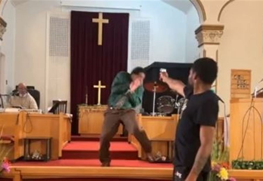 إلا أن مسدس الرجل لم يعمل وتعطل فجأة وخلال ذلك ابتعد الكاهن عن طريقه، وقفز شماس الكنيسة أمام الكاميرا، وتعامل مع المسلح وأرداه أرضا محاولاً تثبيته.