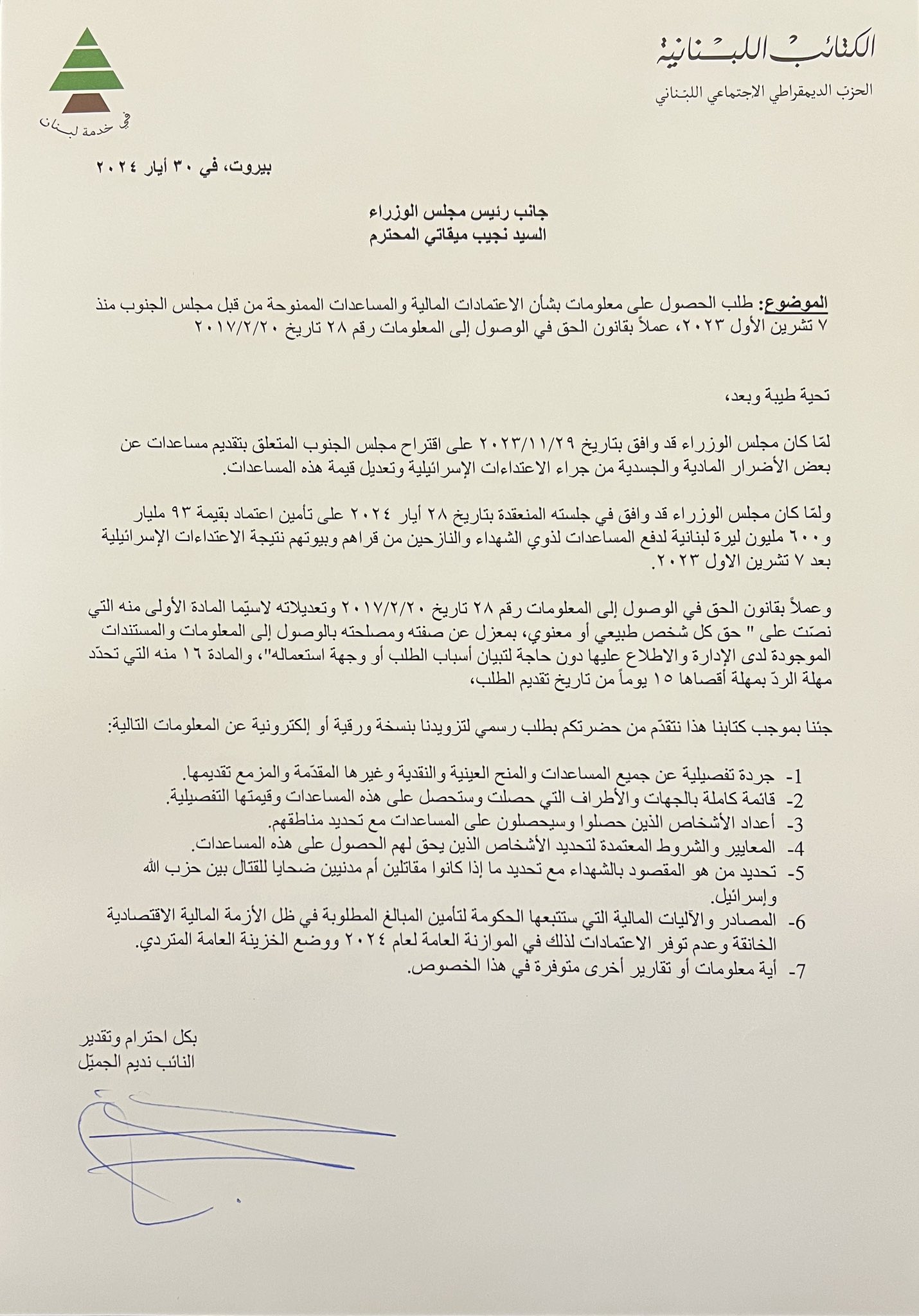 تقدمت اليوم امام مجلس الوزراء بطلب الحصول على معلومات بشأن الاعتمادات المالية والمساعدات الممنوحة من قبل مجلس الجنوب منذ ٧ تشرين الاول ٢٠٢٣. pic.twitter.com/VPZwFmZ8YP
