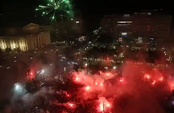وتحولت مدينة بيريوس الساحلية الواقعة خارج أثينا مباشرة حيث يوجد مقر أولمبياكوس، بسرعة إلى مشهد من الألعاب النارية والألوان القرمزية مع بدء المشجعين احتفالاتهم.
