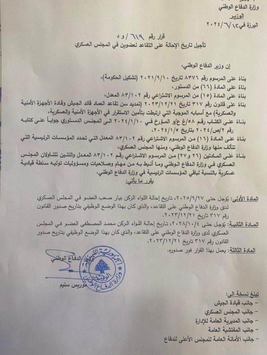 وفي التفاصيل أن وزير الدفاع موريس سليم أصدر أمس قراراً بتمديد سنّ تقاعد عضوَي المجلس العسكري لدى وزارة الدفاع اللواء الركن بيار صعب حتى 27/09/2025، واللواء الركن محمد مصطفى إلى 04/10/2028.