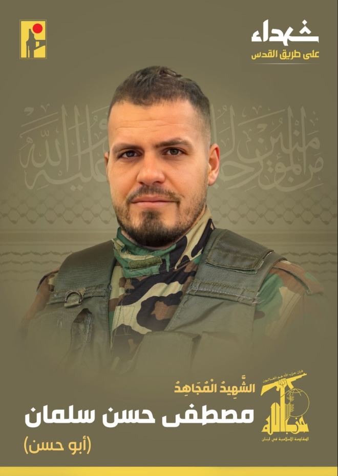 صدر عن المقاومة الإسلامية حزب الله، اليوم الاثنين، بيان جاء فيه: "بمزيد من الفخر والإعتزاز، تزف المقاومة الإسلامية الشهيد المجاهد مصطفى حسن سلمان "أبو حسن" مواليد عام 1991 من بلدة القليلة في جنوب لبنان، والذي ارتقى شهيداً على طريق القدس".