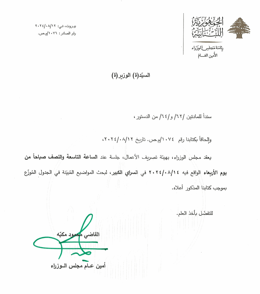 يعقد مجلس الوزراء جلسة يوم الأربعاء في السراي الكبير عند الساعة التاسعة والنصف.