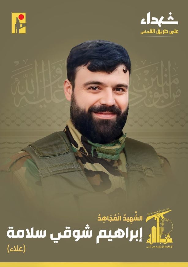 صدر عن المقاومة الاسلامية حزب الله، اليوم الجمعة، بيان جاء فيه: "بمزيد من الفخر والإعتزاز، تزف المقاومة الإسلامية الشهيد المجاهد إبراهيم شوقي سلامة "علاء" مواليد عام 1984 من بلدة بليدا في جنوب لبنان، والذي ارتقى شهيداً على طريق القدس".