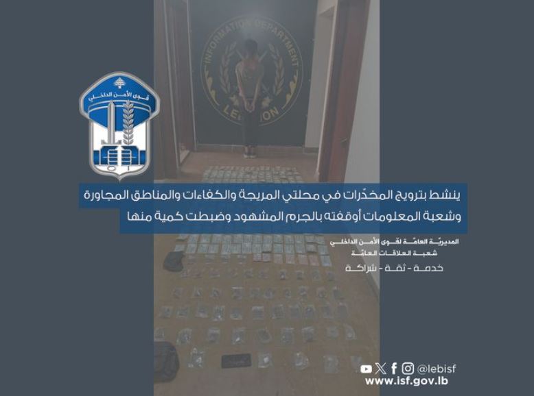 صــدر عــــن المديريّـة العـامّـة لقــوى الأمــن الـدّاخلي ـ شعبة العـلاقـات العـامّـة، اليوم الثلاثاء، بيان جاء فيه: "في إطار المتابعة اليومية التي تقوم بها قوى الأمن الداخلي لمكافحة عمليات تجارة وترويج المخدّرات في مختلف المناطق اللبنانية، توافرت معطيات لدى شعبة المعلومات في قوى الأمن الدّاخلي عن شخص مجهول الهويّة يقوم بترويج المخدّرات في محلّتي المريجة والكفاءات والمناطق المجاورة".