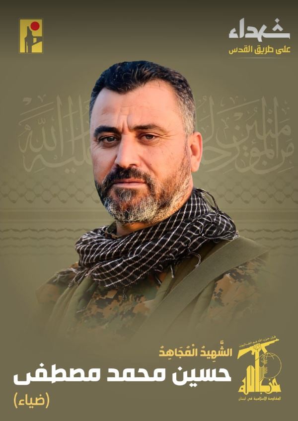صدر عن المقاومة الإسلامية - "حزب الله"، اليوم الأربعاء، بيان جاء فيه: "بمزيد من الفخر والإعتزاز، تزف المقاومة الإسلامية الشهيد المجاهد حسين محمد مصطفى "ضياء" مواليد عام 1975 من بلدة بيت ليف في جنوب لبنان، والذي ارتقى شهيداً على طريق القدس".