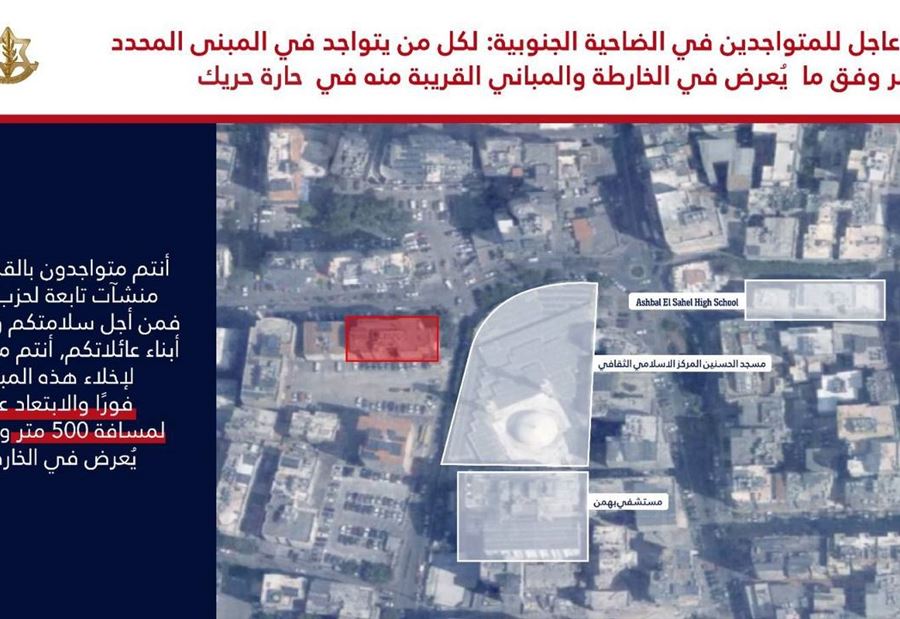 وجّه المتحدث باسم الجيش الإسرائيلي، أفيخاي أدرعي، إنذاراً عاجلاً إلى "سكان الضاحية الجنوبية، وتحديداً المتواجدين في المباني المذكورة في الخارطتين الواقعة في حارة حريك وحدث بيروت."
