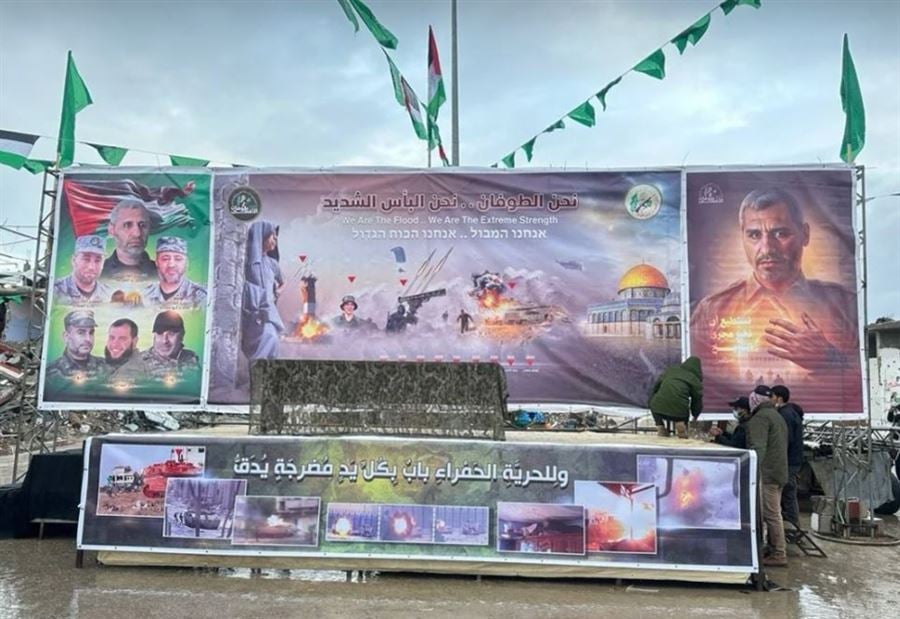 شهدت ساحة تسليم الدفعة السابعة من تبادل المحتجزين والأسرى في قطاع غزة، اليوم السبت، رسائل قوية من حركة حماس إلى إسرائيل، معبرة عن روح التحدي والمقاومة. تزينت الساحة بلافتة ضخمة حملت علم فلسطين وقبضة يد مرفوعة، مكتوب عليها: "اخلع حذاءك فكل شبر من هذه الأرض روي بدماء الشهداء"، في رسالة رمزية تنبض بالعزة والإصرار.
