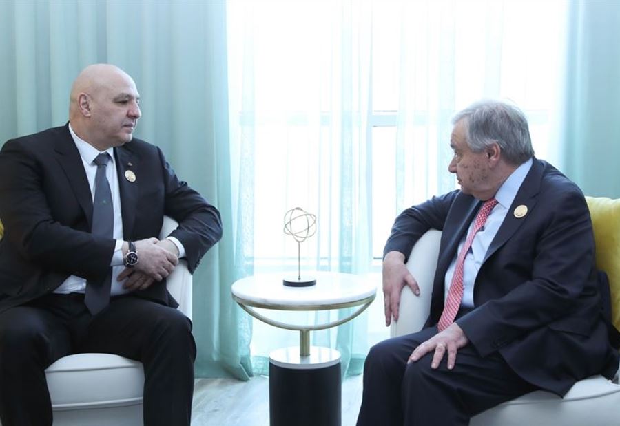 في بداية اللقاء، شكر الرئيس عون غوتيريس على الدعم الذي تقدمه الأمم المتحدة لمساعدة لبنان، خصوصًا المهمات الكبيرة التي تقوم بها القوات الدولية في الجنوب رغم الصعوبات التي تواجهها. واعتبر الرئيس عون أن بقاء الإسرائيليين في عدد من التلال على الأراضي اللبنانية وعدم تمركز الجيش فيها قد يعيق تحقيق الاستقرار وتنفيذ القرار الدولي 1701، وكذلك اتفاق وقف إطلاق النار الذي تم التوصل إليه في 27 تشرين الثاني 2024 وفي 18 شباط الماضي.