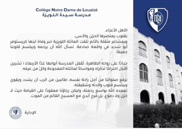 أعلنت مدرسة سيدة اللويزة في بيان، إقفال أبوابها غداً حداداً على روح الطالب كريستوفر أبو شديد.