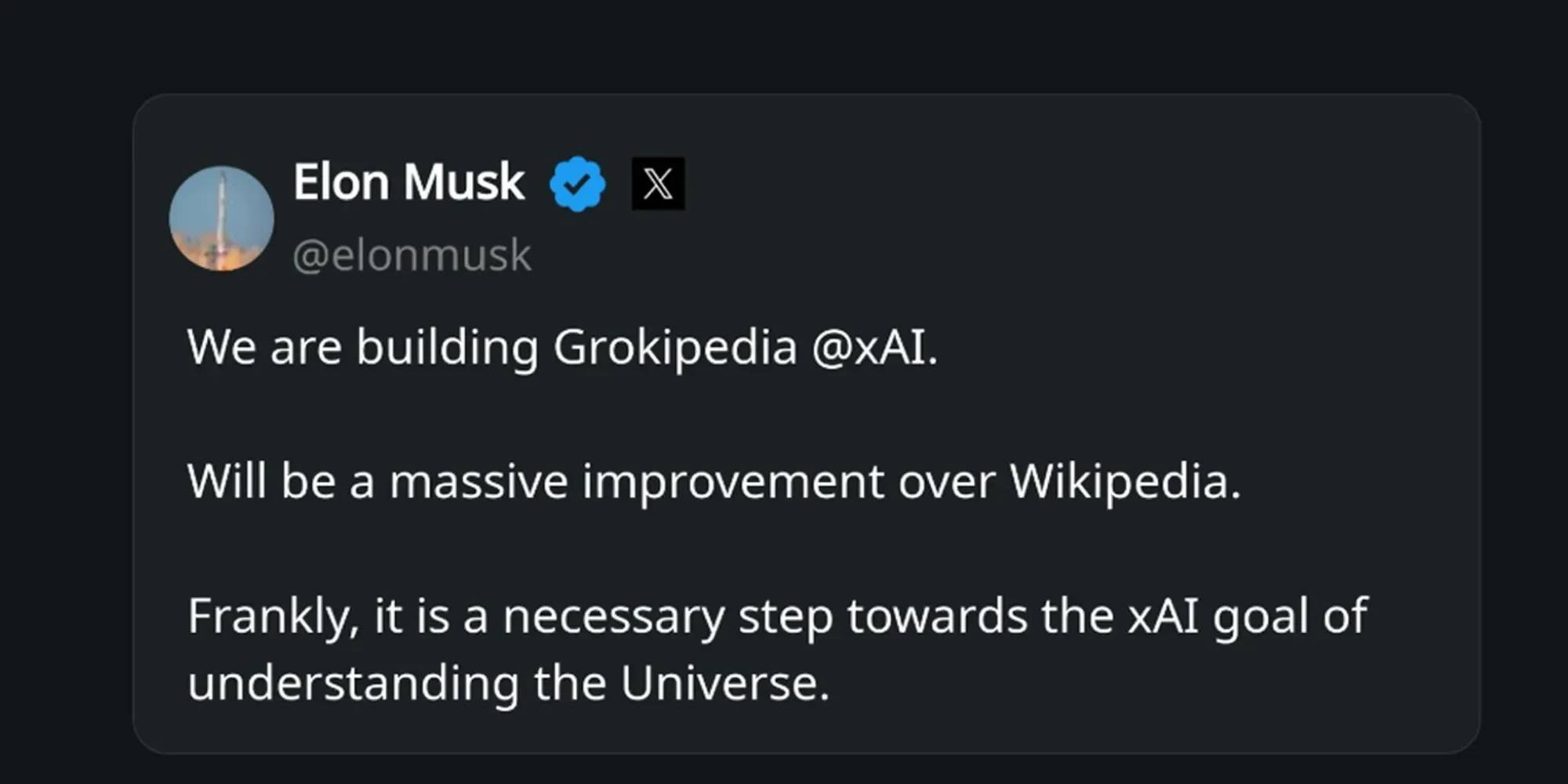 أعلن الملياردير الأميركي إيلون ماسك، الثلاثاء، عن خطط لتطوير منصة جديدة لمنافسة ويكيبيديا، عبر شركته للذكاء الاصطناعي xAI، تحمل اسم "غروكيبيديا".