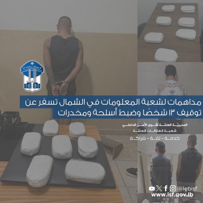 صدر عن المديريّة العامّة لقوى الأمن الدّاخلي ـ شعبة العلاقات العامّة بيان جاء فيه: "في إطار الخطّة الأمنيّة التي وضعتها شعبة المعلومات للحفاظ على الأمن والاستقرار في مختلف المناطق اللّبنانية، وبخاصةٍ ضمن محافظة الشّمال، نفّذت دوريّات الشّعبة بتواريخ 23، 24 و25-9-2025 كمائن ومداهمات في أماكن وجود مطلوبين ومشبوهين، ضمن مدينة طرابلس، حيث أوقفت بنتيجتها ثلاثة عشر شخصاً، وهم كلٌّ من: