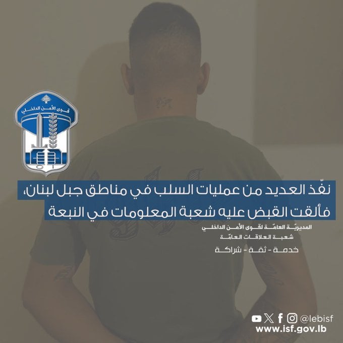 صدر عن المديريّة العامّة لقوى الأمن الدّاخلي ـ شعبة العلاقات العامّة بيان جاء فيه: "في إطار المتابعة اليوميّة التي تقوم بها القطعات المختصّة في قوى الأمن الدّاخلي لمكافحة عمليّات السّلب في مختلف المناطق اللّبنانية، توافرت معطيات لشعبة المعلومات حول قيام شخص مجهول الهويّة بتنفيذ عمليّات سلب في مناطق عدّة من محافظة جبل لبنان".