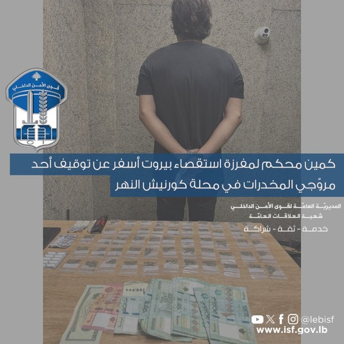صدر عن المديريّة العامّة لقوى الأمن الدّاخلي ـ شعبة العلاقات العامّة بيان جاء فيه: "في إطار المتابعة المستمرة التي تقوم بها قوى الأمن الدّاخلي لمكافحة الجرائم في مختلف المناطق اللبنانيّة وتوقيف مرتكبيها، ولا سيما تلك المتعلقة بتجارة وترويج المخدرات، توافرت معطيات لدى مفرزة استقصاء بيروت في وحدة شرطة بيروت حول شخص يقوم بترويج المخدرات في محلة النهر – الدخولية، ويُدعى