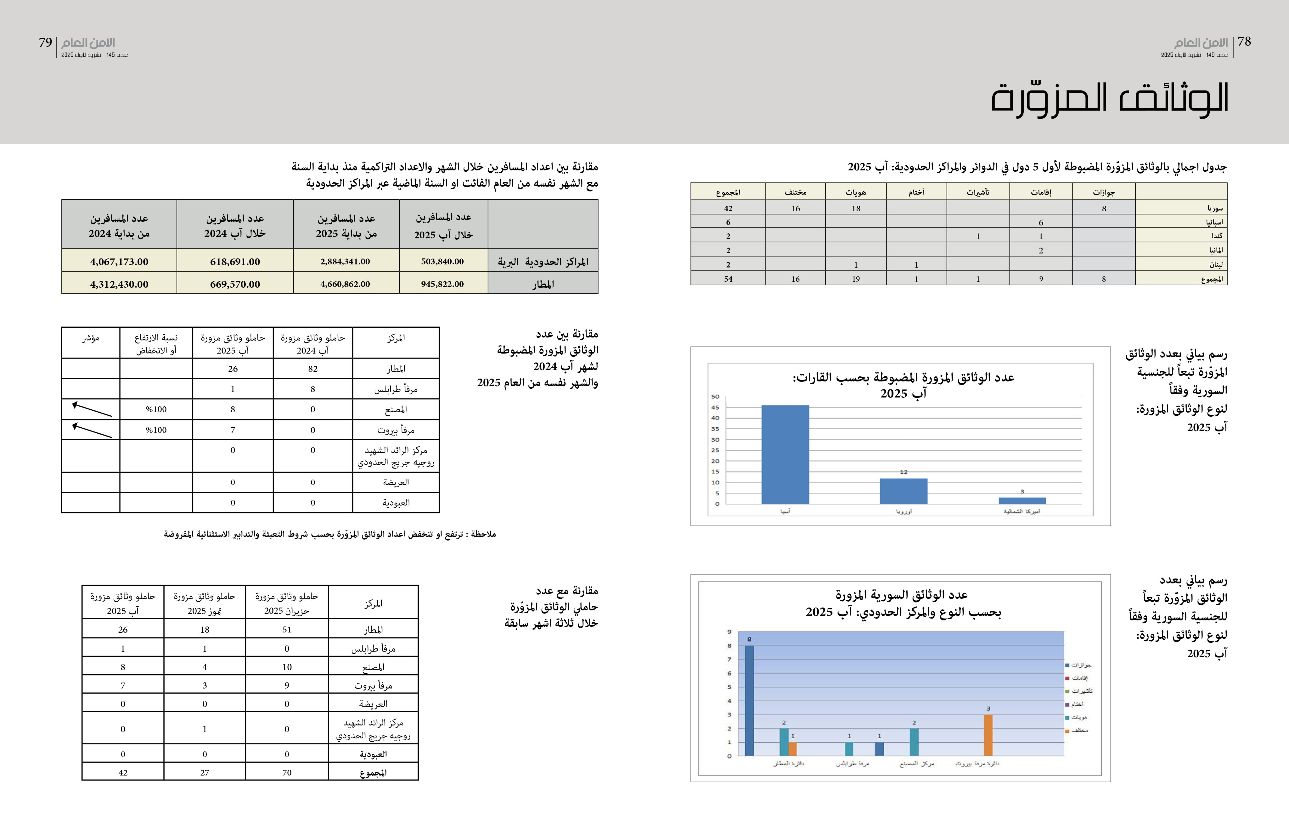 صدر عن مكتب شؤون الإعلام في الأمن العام، اليوم الخميس، الإحصاءات الشهرية لحالات التزوير التي ضُبطت من قبل عناصر الأمن العام اللبناني في الدوائر والمراكز الحدودية كافة، وفقاً للجداول المرفقة ربطاً.