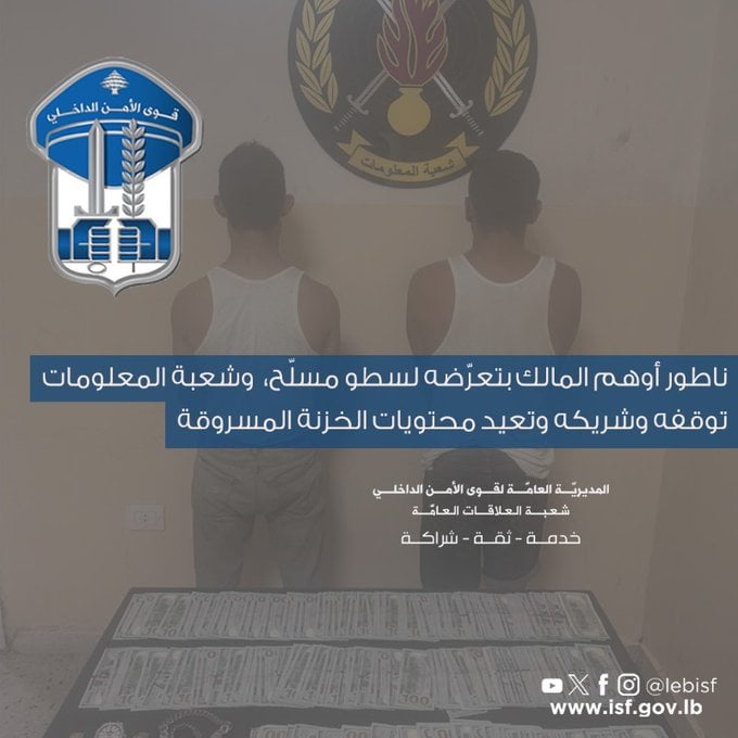 وختم البيان: "أعيدت المسروقات إلى صاحبها، وأجري المقتضى القانوني بحق الموقوفَين، وسُلّما إلى المرجع المعني، بناءً على إشارة القضاء المختصّ".
