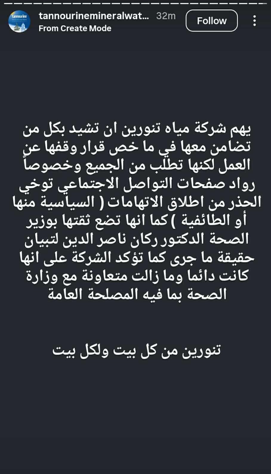 أصدرت شركة مياه تنورين بيانًا عبر خاصية الستوري على حسابها الرسمي على "إنستاغرام"، جاء فيه: "يهم شركة مياه تنورين أن تشيد بكل من تضامن معها في ما خص قرار وقفها عن العمل لكنها تطلب من الجميع وخصوصاً رواد صفحات التواصل الاجتماعي توخي الحذر من إطلاق الاتهامات (السياسية منها أو الطائفية) كما أنها تضع ثقتها بوزير الصحة الدكتور ركان ناصر الدين لتبيان حقيقة ما جرى."