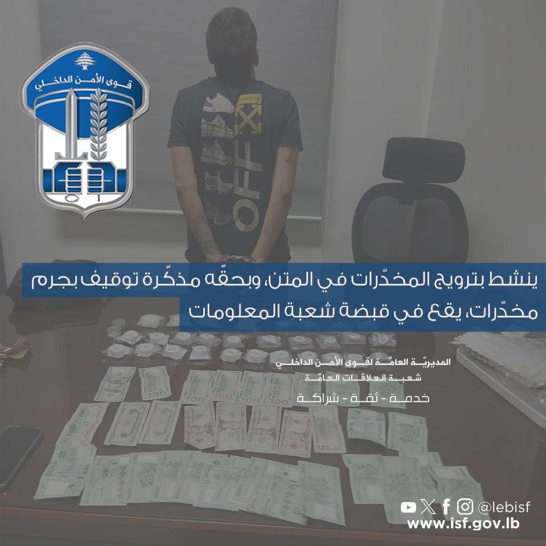 صدر عن المديريّة العامّة لقوى الأمن الدّاخلي ـ شعبة العلاقات العامّة، اليوم السبت، البلاغ التّالي: "في إطار المتابعة المستمرّة التي تقوم بها قوى الأمن الدّاخلي لمكافحة عمليات ترويج المخدّرات في مختلف المناطق اللبنانية، توافرت معطيات لشعبة المعلومات حول قيام شخص مجهول بترويج المخدّرات في مختلف مناطق المتن".