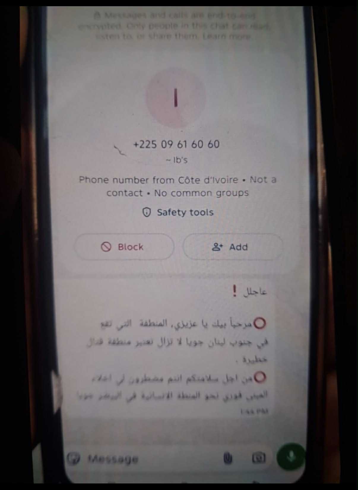 في حادثة أثارت حالة من الذعر في بلدة جويا جنوب لبنان، تلقت مجموعة من سكان "سنتر بيدر" رسالة نصية من رقم دولي (00225)، يعود إلى ساحل العاج، تطالبهم بإخلاء المبنى فورًا بسبب اعتباره "منطقة قتال خطيرة".