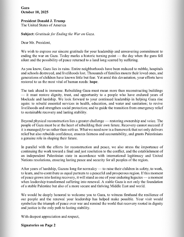 وفي تقرير بثّته القناة مساء الثلاثاء، تحدّث إياد أبو رمضان، رئيس غرفة التجارة في غزة، عن المبادرة قائلاً إنّ مجموعة من المثقفين والمهندسين والعاملين في المجال الإنساني أعدّت خطة متكاملة لإدارة غزة بعد وقف إطلاق النار، وقد وجّهت رسالة إلى الرئيس ترامب عبّرت فيها عن شكرها لدوره في التوصل إلى الهدنة ودعته إلى زيارة القطاع.