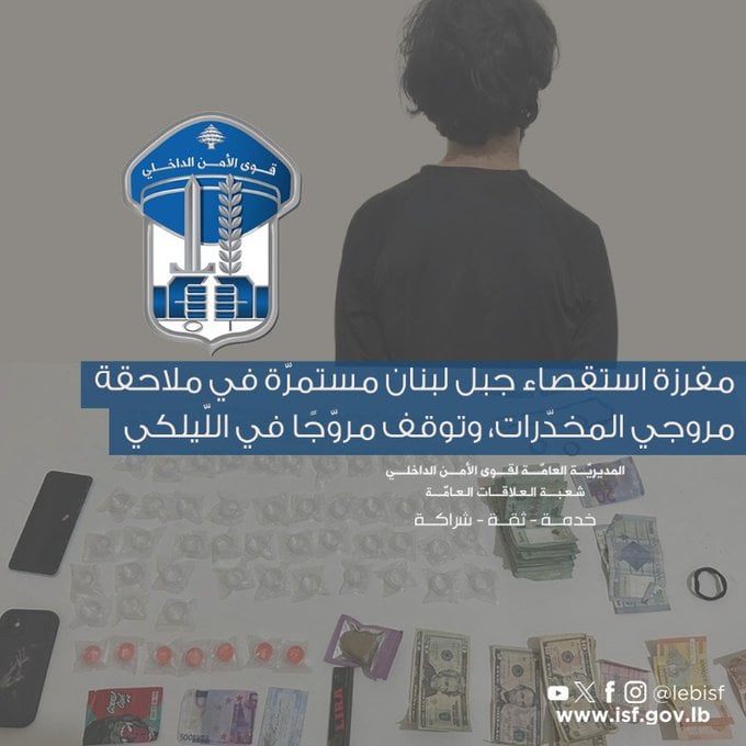 صدر عن المديريّة العامّة لقوى الأمن الدّاخلي ـ شعبة العلاقات العامّة، اليوم الاربعاء، البلاغ التّالي: "في إطار المتابعة المستمرّة التي تقوم بها قوى الأمن الداخلي لمكافحة جميع أنواع الجرائم في مختلف المناطق اللبنانية وتوقيف مرتكبيها، توافرت معطيات لدى مفرزة استقصاء جبل لبنان حول قيام شخص بترويج المخدّرات في محلّة الليلكي، وذلك على متن دراجة آلية نوع “GR”".