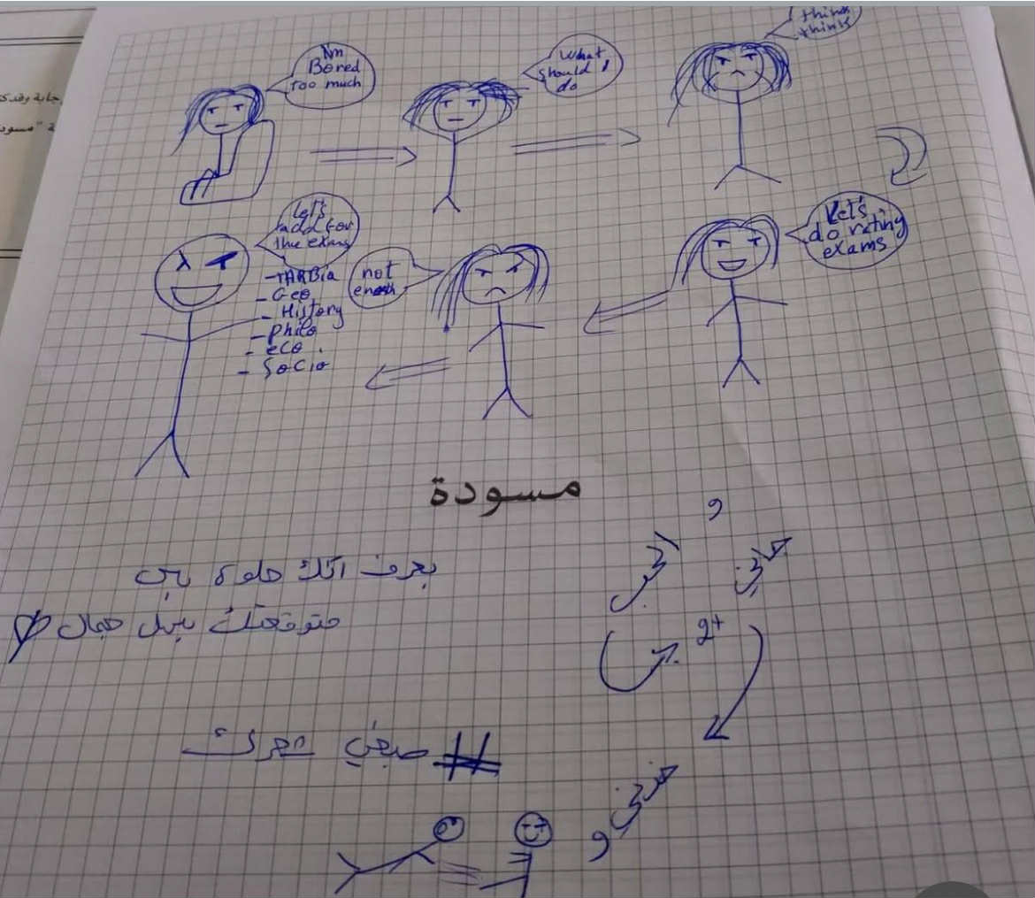 فيما رسم آخر صورة الوزيرة تدخن النرجيلة في حين ان الطالب قبالتها يعجز عن الاجابة على الاسئلة، وكتبوا لها كلمات اعنية "يا ريك تنبك معسل وتحرقيني بارغيلة" ،فيما ذهب البعض للتنمر على لون شعر الوزيرة باهدائها صبغة شعر، واستذكر بعضهم خلال الاجابة ما قاله لها احد الطلاب خلال جولتها على الامتحانات الرسمية"بعرف انك حلوة بس ما توقعتك بهل الجمال".