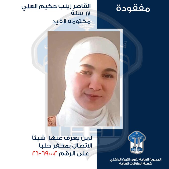 صدر عن المديريّة العامّة لقوى الأمن الدّاخلي ـ شعبة العلاقات العامّة بلاغ جاء فيه: "تُعمِّم المديريّة العامّة لقوى الأمن الدّاخلي بناءً على إشارة القضاء المختصّ صورة المفقودة القاصر: زينب حكيم العلي (مواليد 2008، مكتومة القيد) التي غادرت منزلها الزوجي في بلدة عرقا – عكّار بتاريخ 22-10-2025 إلى جهة مجهولة، ولم تَعُد لغاية تاريخه.