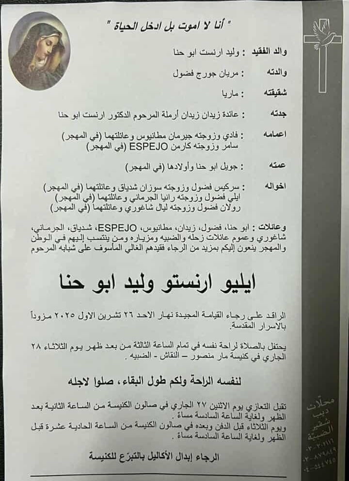يُحتفل بالصلاة لراحة نفس الشاب أبو حنا عند الساعة الثالثة من بعد ظهر يوم الإثنين ٢٧ تشرين الأول ٢٠٢٥، في كنيسة مار منصور – النقاش، ثم يُوارى الثرى في مدافن العائلة.