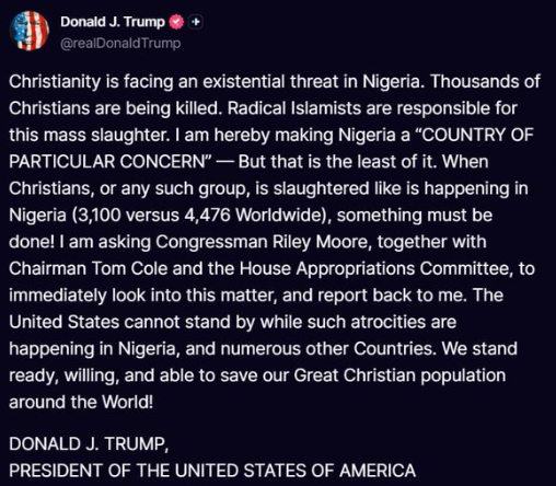 وقال ترامب، في منشور على منصة "ترُوث سوشيال"، إنّ "آلاف المسيحيين يُقتلون" في نيجيريا، محمّلًا الجماعات الإسلامية المتطرفة مسؤولية ما وصفه بـ"المذبحة الجماعية".