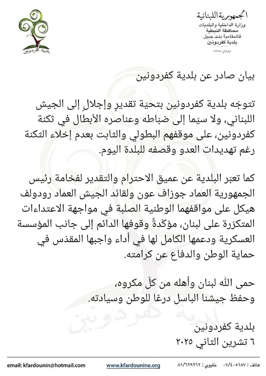 شهدت بلدة كفردونين الجنوبية تطوراً لافتاً، بعدما رفضت وحدة من الجيش اللبناني إخلاء "ثكنة الشهيد محمد فرحات"، الواقعة على بعد نحو 200 متر فقط من المبنى الذي وجّه إليه الجيش الإسرائيلي إنذاراً سابقاً بضرورة إخلائه والابتعاد عنه لمسافة لا تقل عن 500 متر.