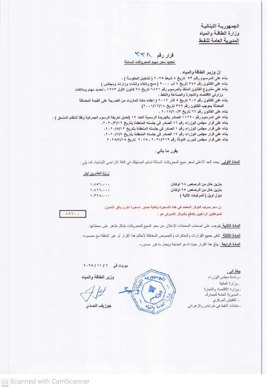 صدر عن وزارة الطاقة والمياه صباح اليوم الجمعة, جدولٌ جديد للمحروقات، وجاءت الأسعار على الشّكل التالي: